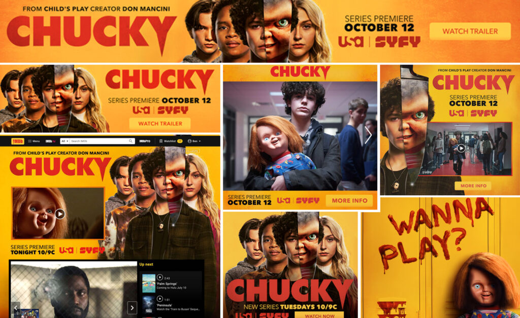 Chucky is the first television version of the beloved horror icon ‘Chucky’. The campaign focused on a combination of his horror roots and his pop culture status. The visuals were bright, hinging on the yellow ‘God Guys’ box color. One variation of the key art highlighted the cast with a hint of Chucky and his classic knife. The other nodded to a high school, the new location of his terror rampage. The school version juxtaposed the ‘good guy’ friendly side of Chucky with typography written in blood across the lockers. In both cases, we wanted to acknowledge the impending danger of this killer doll without hitting it head on. The campaign included OOH billboards, a digital media buy, digital platform assets, Comic Con placement, social units and on-air promos.